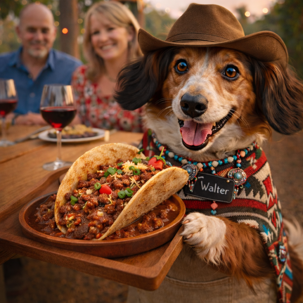 - Southwestern beef chile served inside a toasted taco shell — meaning you can eat the chile and the plate. We believe in efficiency.
